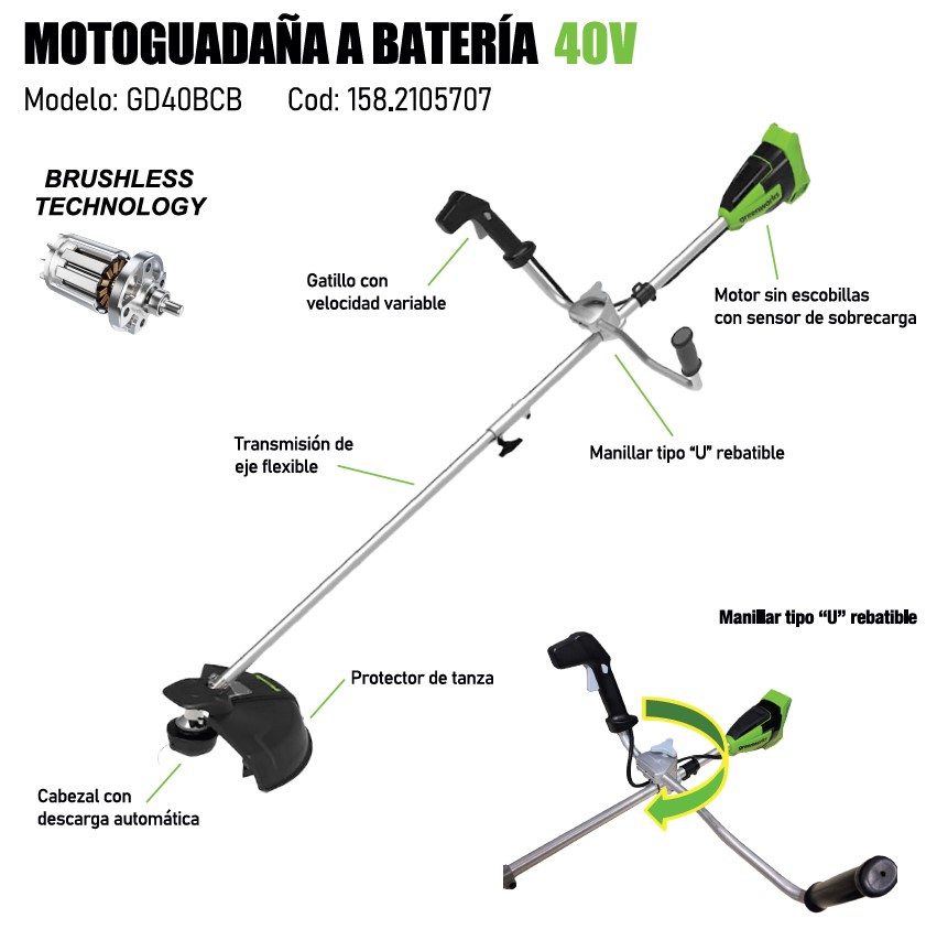 Potencia para maleza dura, comodidad para grandes áreas. La Greenworks GD40BCB es una desmalezadora de doble función (tanza y disco) equipada con un motor Brushless (sin carbones) de alto torque. Su diseño con manillar abierto (tipo bicicleta) y arnés incluido permite trabajar en superficies extensas sin fatiga, eliminando hierba alta y maleza resistente con la misma eficacia que una máquina a gasolina, pero en completo silencio.