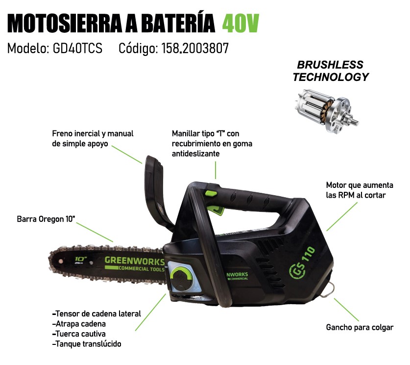 Potencia profesional, cero emisiones. La motosierra Greenworks GD40TCS está diseñada específicamente para la poda de altura y trabajos de precisión. Equipada con un motor Brushless (sin carbones) de alto rendimiento, ofrece la fuerza de una motosierra a nafta de 25cc, pero sin el ruido, los humos ni el mantenimiento del motor de combustión. Ligera, equilibrada y lista para trabajar al instante.