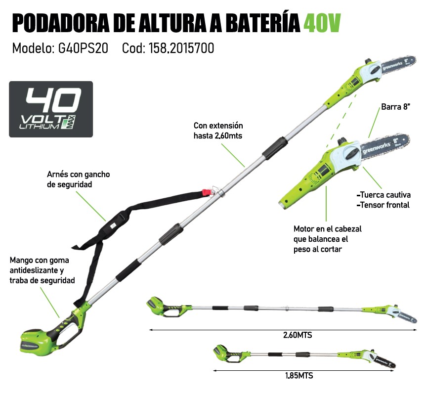 Podadora de altura G40PS20 40v a bateria GREENWORKS