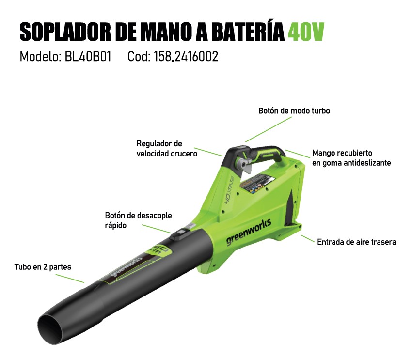 Olvídate de la escoba y el rastrillo. El Greenworks BL40B01 está diseñado para quienes valoran su tiempo. A diferencia de los sopladores convencionales, este modelo incorpora un diseño de turbina Axial (similar a la turbina de un avión), lo que le permite propulsar el aire con mayor eficiencia y fuerza a través de la boquilla.
