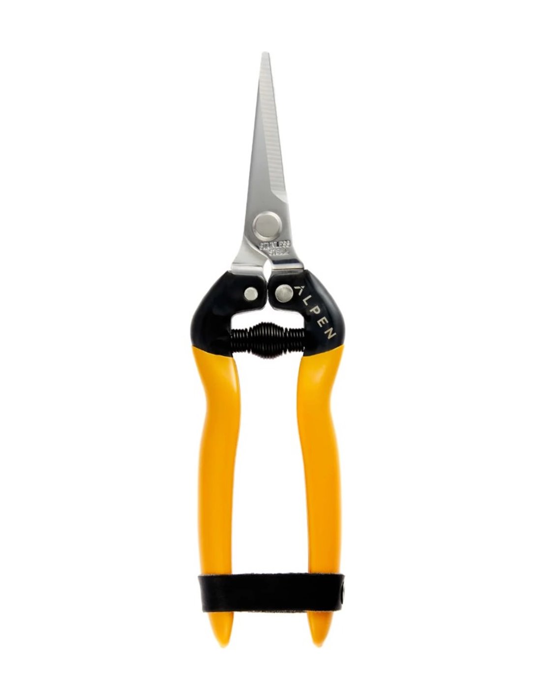 Hoja: Acero inoxidable japonésMangos: Mangos de metal con recubrimiento de óxido negro y empuñaduras de PVC amarillo (libre de ftalatos) / logo ALPEN grabado con láser